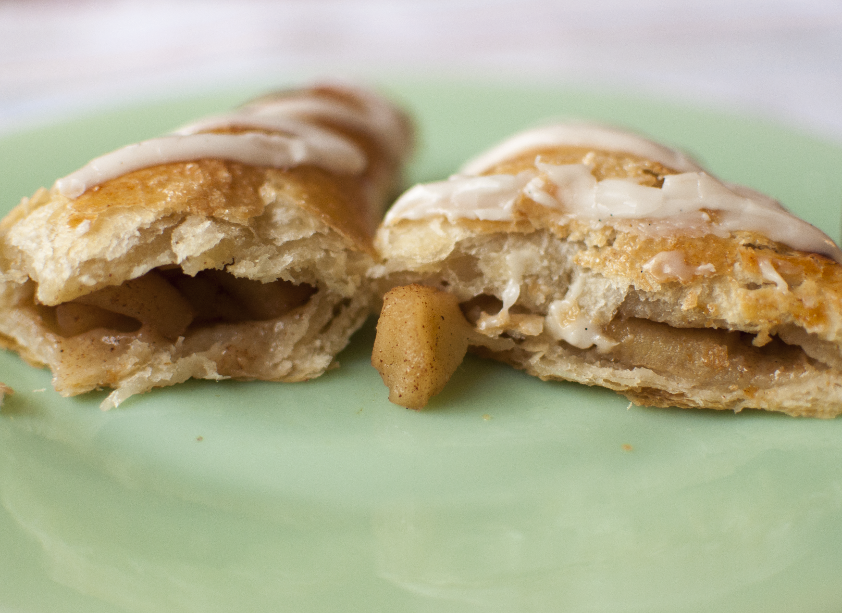 - Bake the pies for 20 minutes, or until golden brown and puffy. Serve immediately. {Note: You can add a quick vanilla glaze by mixing some powdered sugar with milk and a little vanilla extract/paste. Stir to get the desired consistency, then spoon over the cooled turnovers. Or you can add it to a little Ziplock bag and pipe stripes over them.}